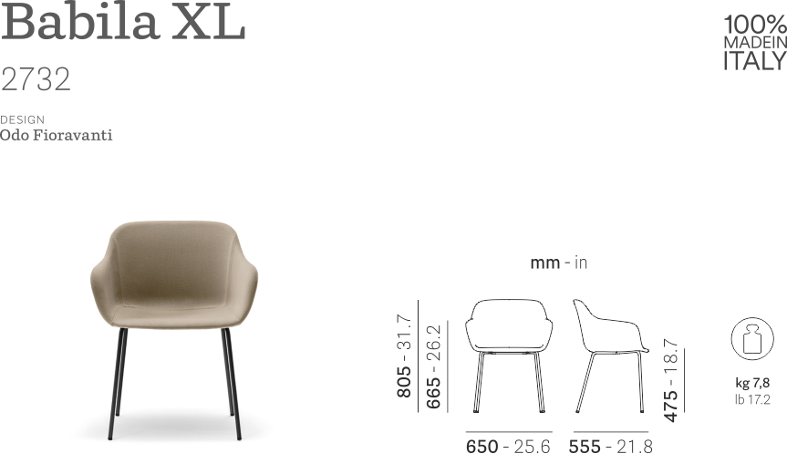 Babila XL si inserisce armonicamente all’interno di una collezione che si muove con agilità tra tradizione e innovazione. Una poltrona con scocca imbottita rivestita in tessuto che si connota per le dimensioni ampie della seduta e del bracciolo. Gambe in tubo d'acciaio Ø 16 mm.