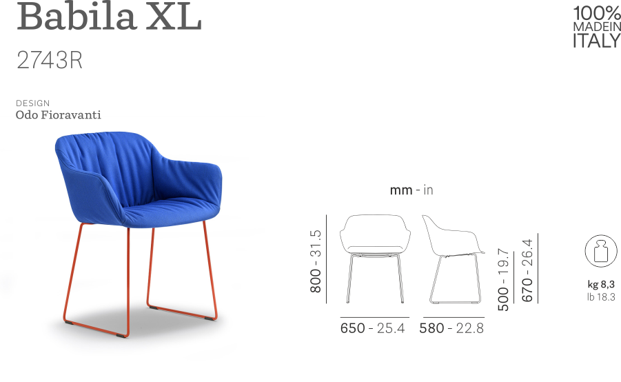 Babila XL si inserisce armonicamente all’interno di una collezione che si muove con agilità tra tradizione e innovazione. Una poltrona con scocca stampata in polipropilene riciclato – 50% da scarto di materiale plastico post consumo e 50% da scarto di materiale plastico industriale – che si connota per le dimensioni ampie della seduta e del bracciolo. Il rivestimento imbottito la rende completamente sfoderabile in modo da poterla facilmente pulire, manutenere e separare dal resto del prodotto. Gambe a slitta in tondino d'acciaio Ø 11 mm.