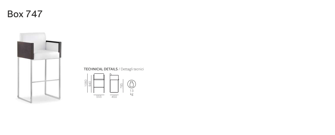 Box presenta forme rigorose e utilizza materiali diversi quali legno, metallo e imbottito. Sgabello con struttura in tamburato di rovere con sedile, schienale e fianchi imbottiti e rivestiti in tessuto, pelle o eco-pelle. Telaio a slitta in tubo d'acciaio 20x20 mm con poggiapiedi.