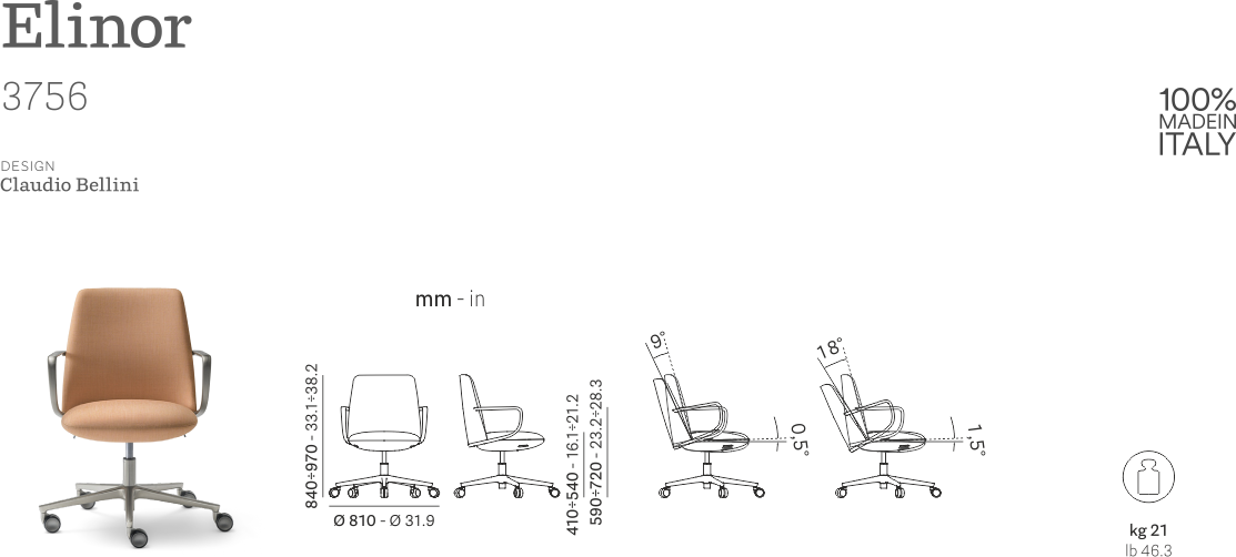 La poltrona operativa elinor low back è caratterizzata da uno schienale più basso, pensata per collocarsi all’interno di sale riunioni, uffici operativi e abitazioni. La base in pressofusione di alluminio è definita da una forma fluida ed è regolabile in altezza. Un meccanismo sincronizzato autopesante integrato nel sedile imbottito, capace di regolare autonomamente l’intensità dell’oscillazione in funzione del peso corporeo dell’utente, consente di mantenere la schiena in una posizione più comoda. Punti di forza di elinor low back sono il comfort e l’avvolgenza dati dall’imbottitura in schiumato poliuretanico di sedile e schienale. Un bracciolo leggero, sottile e resistente in pressofusione di alluminio delinea la base dello schienale attraverso una linea fluida e continua.