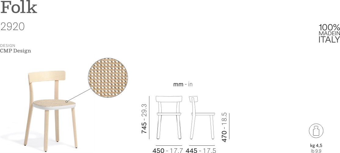 La collezione Folk è il risultato di una ricerca della semplicità. Il carattere amichevole, il tepore del frassino, le dimensioni compatte, le linee morbide e umane sembrano trasmettere l’idea di sedia in un linguaggio universale. Un anello in pressofusione di alluminio, leggero e resistente, diventa l’elemento portante e distintivo della sedia permettendo inoltre un facile disassemblaggio al fine del riciclo e della sostituzione dei componenti. La struttura in frassino abbraccia in modo puntuale l’anello di alluminio che ospita il sedile in paglia di Vienna che garantisce leggerezza ottica e massima resistenza grazie ai fili di nylon inseriti nell’intreccio. Lo schienale in multistrato curvato regala comfort e avvolgenza.