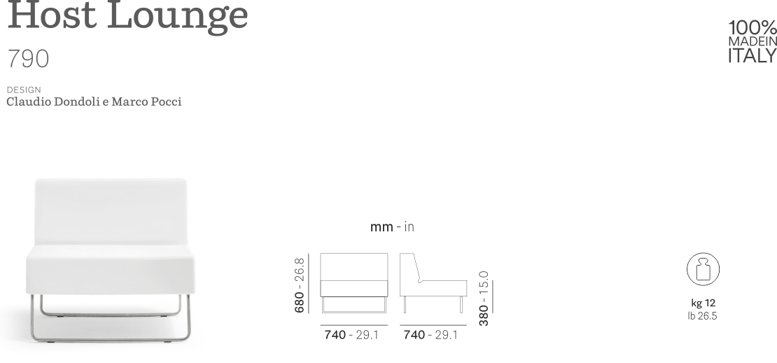 Host Lounge è un sistema modulare e componibile di sedute che si presta a numerose combinazioni e personalizzazioni. Lineare e rigoroso nella forma può infatti essere posizionato in spazi più o meno compatti per creare aree di attesa o di relax a seconda delle esigenze. Il telaio è in tubo d'acciaio cromato di Ø 16mm, la seduta è in polietilene. Il sistema comprende seduta singola e seduta singola con schienale. Ideale per utilizzo outdoor è accessoriabile con gancio di collegamento per i diversi moduli.