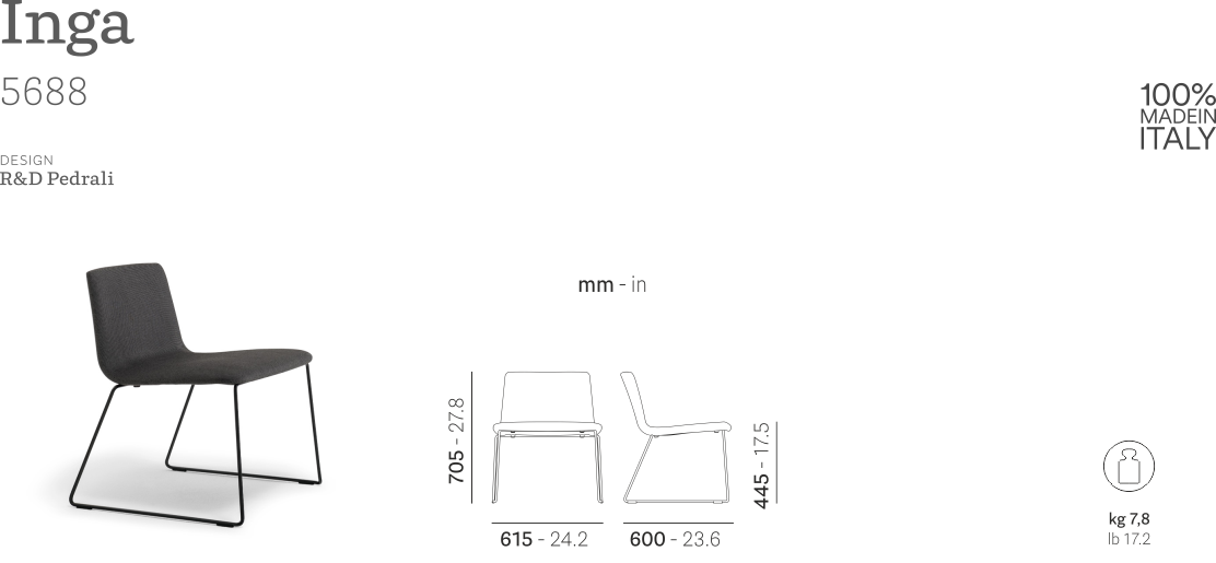 Inga deve il suo nome all'eleganza femminile nord-Europea. Sedia lounge con scocca imbottita rivestita in tessuto o finta pelle e struttura a slitta in tondino d'acciaio Ø 11 mm.