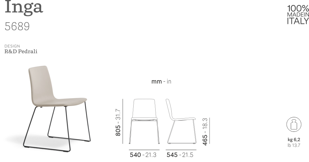 Inga deve il suo nome all'eleganza femminile nord-Europea. Sedia con scocca imbottita rivestita in tessuto o finta pelle e struttura a slitta in tondino d'acciaio Ø 10 mm.