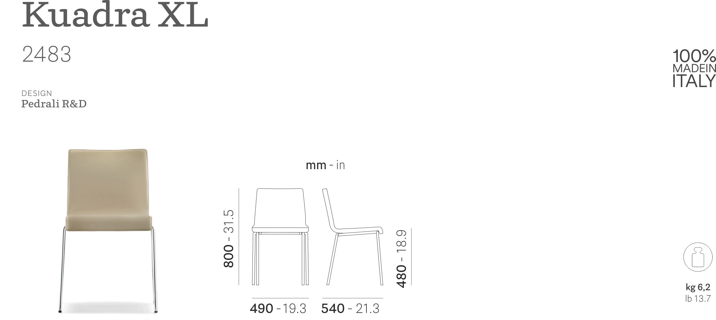 Le dimensioni rese più generose, lo schienale ribassato e l'ampia gamma di finiture connotano Kuadra XL, rendendola ancora più confortevole e versatile. Sedia con scocca imbottita rivestita in tessuto o eco pelle e struttura in tubo d'acciaio Ø 16 mm.