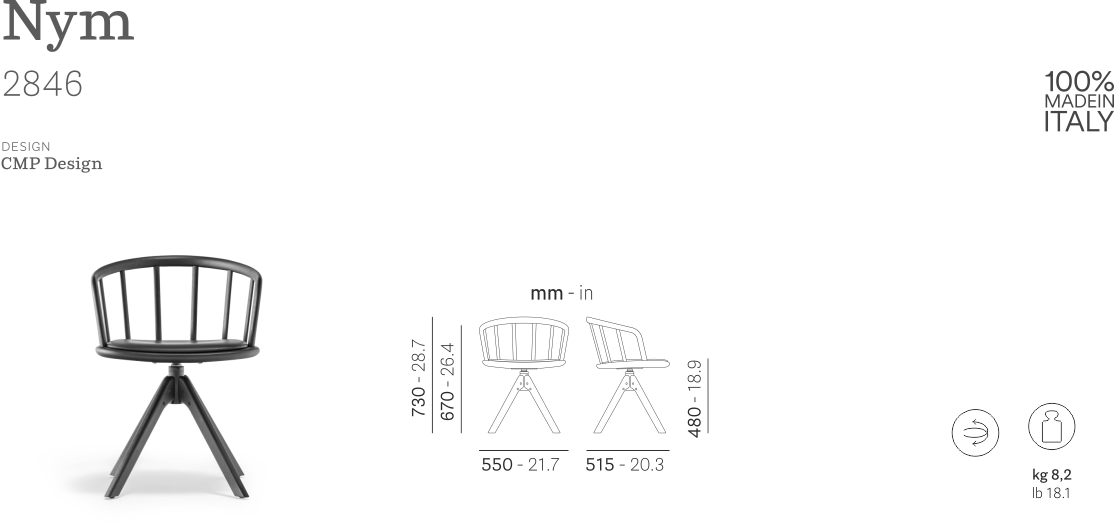 Nym è una collezione in massello di frassino che rivisita in chiave contemporanea le tradizionali sedute Windsor inglesi. Poltroncina con schienale ad arco in legno curvato che si innesta in una soluzione di continuità al sedile in massello sagomato, diventando bracciolo. Versione con sedile imbottito. Profili ellittici corrono lungo tutte le linee, esaltando il calore del legno al tatto e donando massimo comfort e leggerezza. Base girevole con meccanismo di ritorno.