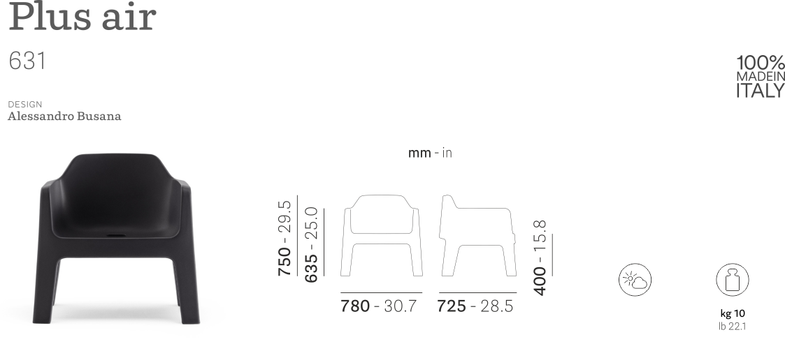 Plus Air deriva dal concept della seduta Plus ed è realizzata in polietilene con la tecnica dello stampaggio rotazionale. Curve e superfici originarie trovano nuove proporzioni per offrire un elevato comfort. Il carattere outdoor traspare da alcuni dettagli come l’ampio foro di scolo per l’acqua posto sulla seduta. E' disponibile in diversi colori.