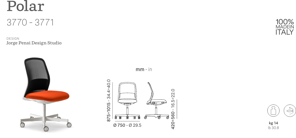 Polar è una seduta operativa che garantisce una massima personalizzazione in termini di ergonomia. Lo schienale ha una struttura in nylon alla quale viene fissata una rete in poliestere traspirante e flessibile, che dona trasparenza. Il supporto lombare è realizzato in polipropilene e può essere rivestito con lo stesso tessuto del sedile. Il sedile è in schiumato poliuretanico e, grazie ad un meccanismo che ne consente il movimento, è possibile regolarne la profondità. Un meccanismo sincronizzato autopesante, che regola autonomamente l’intensità dell’oscillazione in funzione del peso corporeo dell’utente, garantisce adattabilità ed estremo comfort. La base girevole in pressofusione di alluminio è regolabile in altezza.