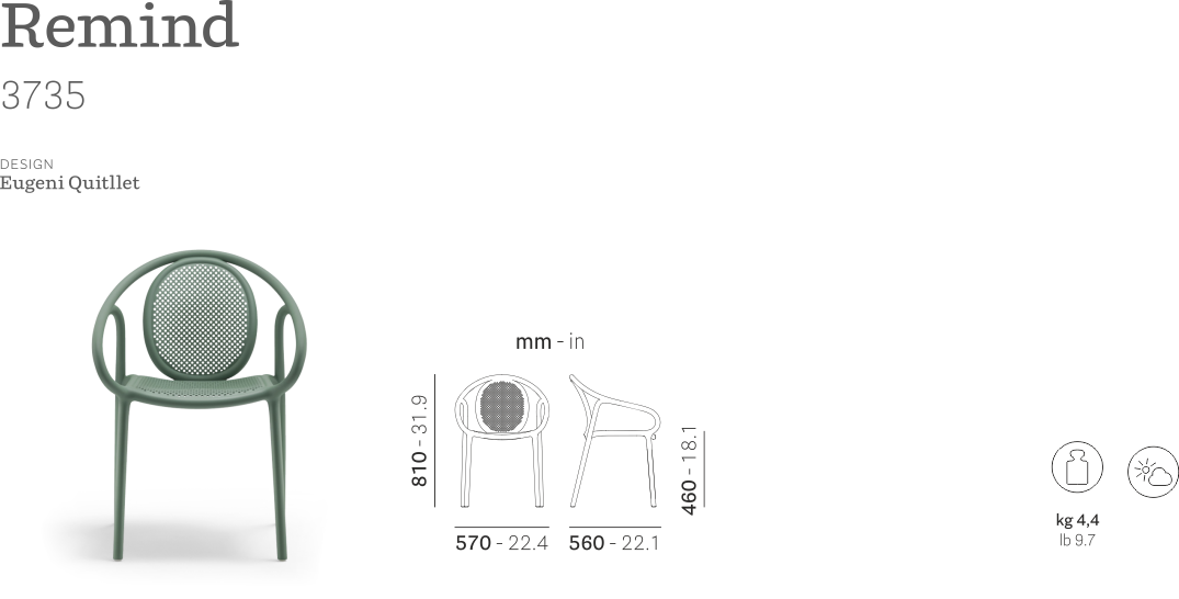 Remind riprende la memoria delle curve morbide e sinuose delle sedie in legno della seconda metà del XIX Secolo. Poltrona monoblocco realizzata in polipropilene stampato a iniezione la cui seduta e schienale si caratterizzano per una texture traspirante che contribuisce a renderla ariosa e ancor più leggera, oltre che confortevole e avvolgente. Lo schienale traforato di Remind può essere decorato con piccoli pixel colorati realizzati in polipropilene, offrendo a tutti la possibilità di diventare artisti, creando infiniti motivi.