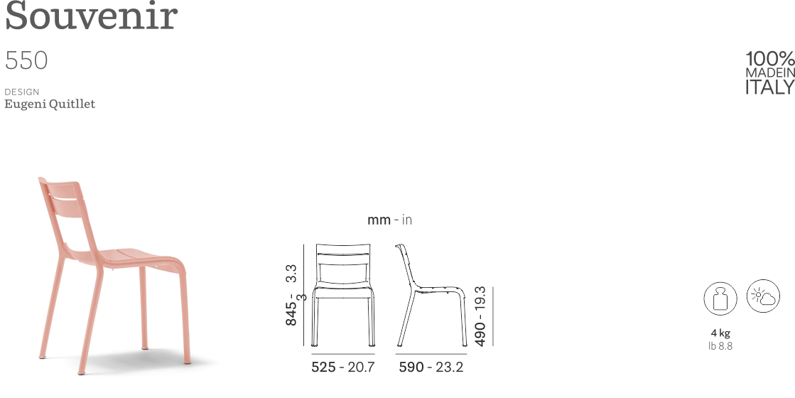 Souvenir nasce dalla volontà di reinterpretare le forme iconiche delle sedie che nel XVIII secolo venivano usate nei giardini parigini. Sedia monoblocco realizzata in polipropilene e pensata specificatamente per l’utilizzo outdoor, caratterizzata da un’armonia di forme in grado di integrare tutti gli elementi che la compongono in modo organico e naturale. Le forme morbide e le doghe tridimensionali rendono la seduta molto confortevole mentre le sue gambe si allargano nella parte finale confluendo in un caratteristico piedino.