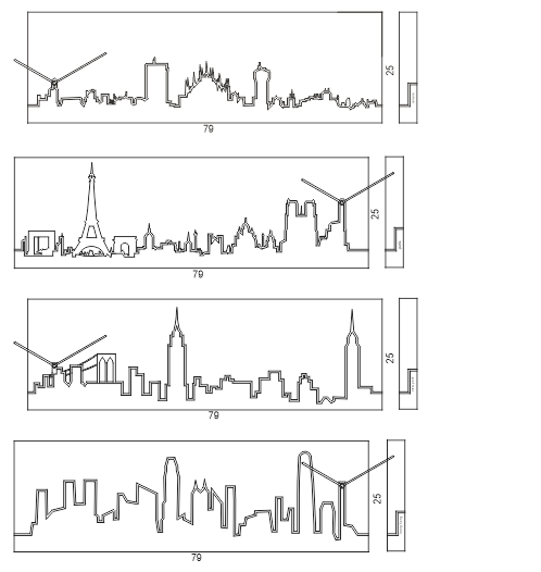 Gli skyline delle città più belle del mondo stilizzate con semplici linee su un fondo che può essere nero, rosso o bianco. Il disegno è bianco sui primi due e nero sull'ultimo. Le città disponibili sono: Parigi, Londra, New York e Hong Kong. Semplice ma di forte impatto Skyline è realizzato in legno, verniciato con vernici atossiche e dotato di un movimento a batteria al quarzo.