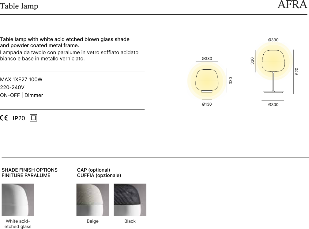Il globo luminoso di Afra, con finitura esterna acidata di colore bianco, si può rivestire con una cuffia decorativa in tessuto, nera o beige, per dare una sfumatura diversa alla luce, perfetta per ambienti residenziali oppure hotel esclusivi.