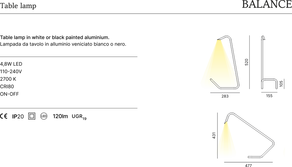 L’alluminio tubolare curvato tratteggia una struttura minimal e sottile, disponibile in due colori, bianco oppure nero goffratino. Balance è frutto di un disegno essenziale che ha previsto per questa lampada una natura mobile. L’equilibrio a cui è ispirato il suo nome deriva dalla possibilità di orientare la lampada in orizzontale e in verticale, per direzionare a piacimento la luce.