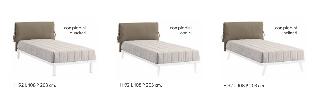 Letto RIO , singolo con testiera imbottita sfoderabile e giroletto in metallo. Piedini quadrati, inclinati, conici. Rete ortopedica a doghe inclusa