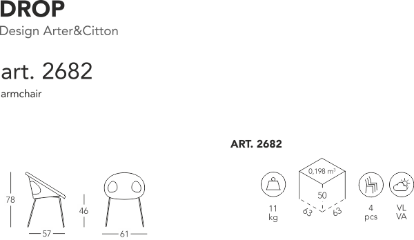Scocca in tecnopolimero riciclabile. Struttura a 4 gambe in tubo d’acciaio ø mm 16 cromato, per uso interno. Struttura a 4 gambe in tubo d’acciaio ø mm 16 zincato e verniciato per uso interno ed esterno. Impilabile.