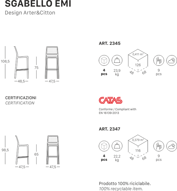 Dall’estetica tradizionale, decorato con piccoli fori, proposto in due altezze e in un’ampia gamma cromatica, la versione sgabello completa la famiglia Emi. Facilmente impilabile, rappresenta una soluzione versatile per gli spazi outdoor, come bar sulla spiaggia e tavolini alti all’aperto.