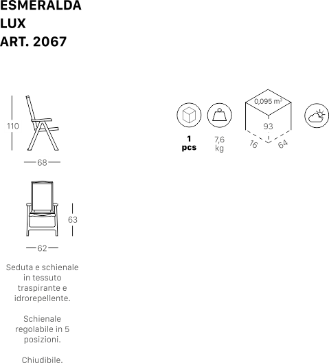 Poltrona chiudibile con struttura in polipropilene. Seduta e schienale in tessuto traspirante idrorepellente. Schienale regolabile in 5 posizioni. Chiudibile.
