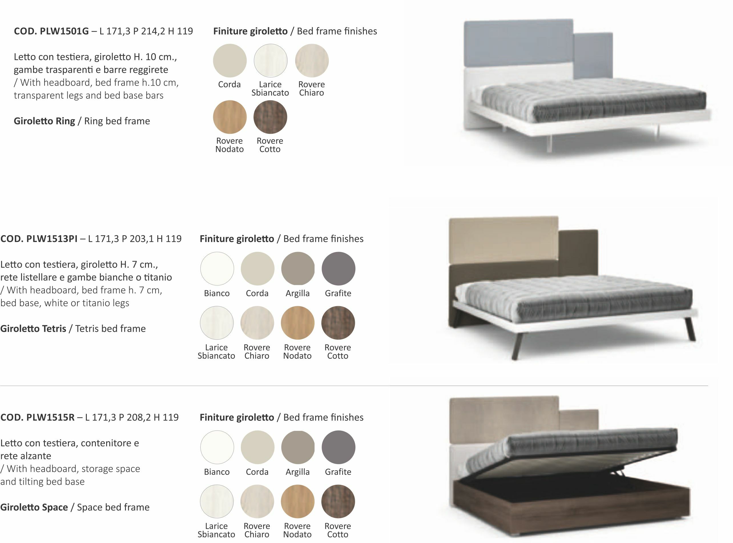 Letto con testiera imbottita e giroletto in legno. Disponibile con piedi trasparenti o metallo.