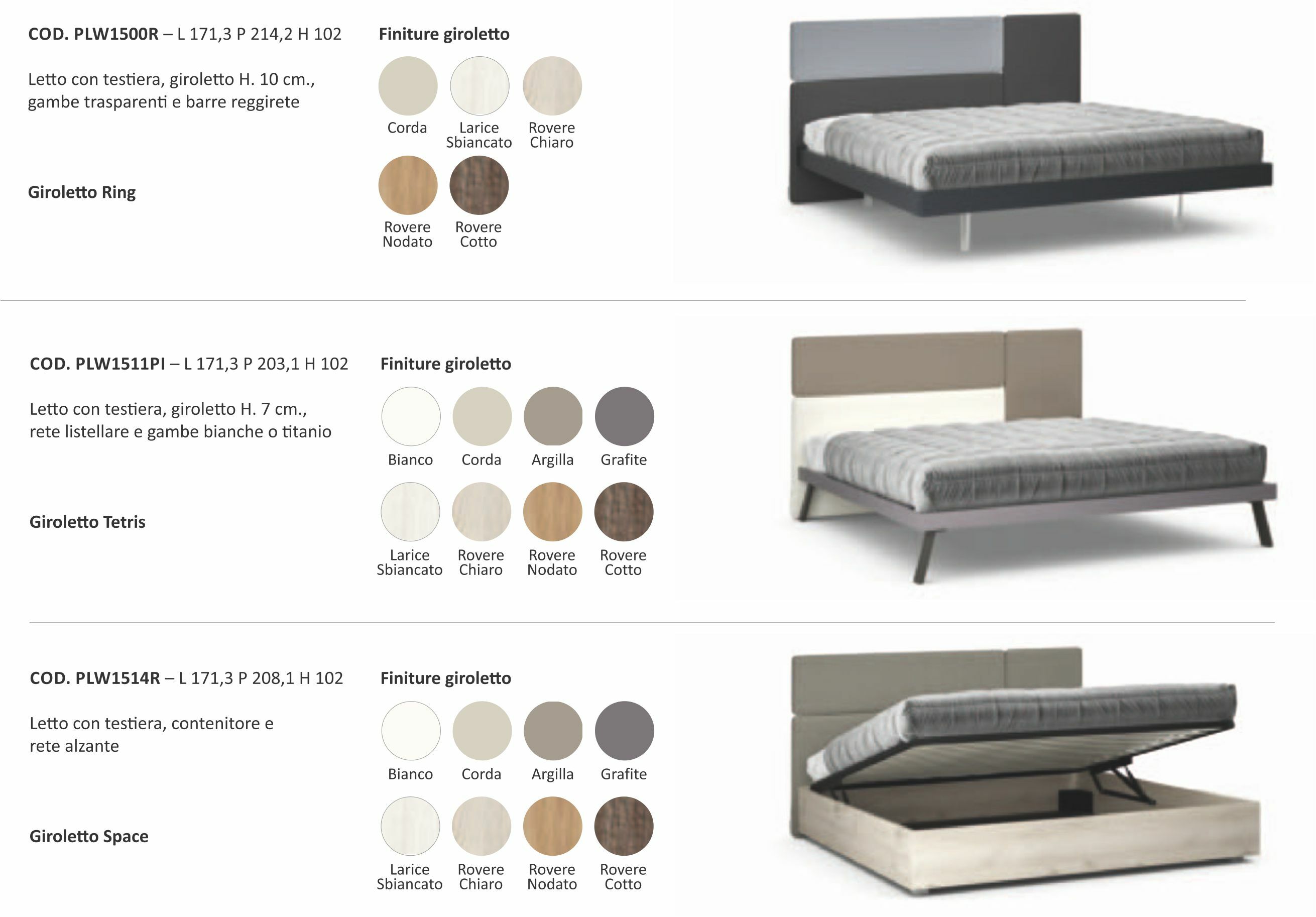 Letto con testiera imbottita e giroletto in legno. Disponibile con piedi trasparenti o metallo.