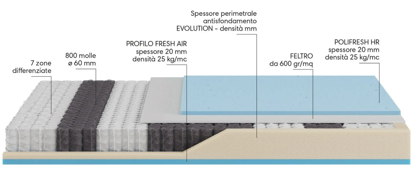 Risveglio sostiene il corpo tutto l’anno unendo la tecnologia delle micromolle all’innovazione del poliuretano. La combinazione dei due materiali restituisce un grado di portanza media. Le800 molle insacchettate donano un solido supporto al corpo in ogni sua posizione. Sul lato superiore e inferiore, le molle sono ricoperte da uno strato inpoliuretano Polifresh HR di 20 mm per garantire comfortevolezza e adattabilità alle forme evitando anomali punti di pressione nelle diverse zone di irrigidimento muscolare. Il lato invernale presenta un morbido e caldo strato di lana merino per trattenere il calore e mantenere la traspirabilità durante la notte. Mentre, il lato estivo possiede una speciale composizione in cotone. Il tessuto di rivestimento in Tencel: un filato naturale, altamente traspirante e rispettoso dell’ambiente. Ha origini completamente naturali e sostenibili, infatti è composto da cellulosa estratta dal legno e ha un processo produttivo privo di fattori contaminanti. La fibra cellulosica dona al Tencel morbidezza e piacevolezza al tatto duraturi nel tempo