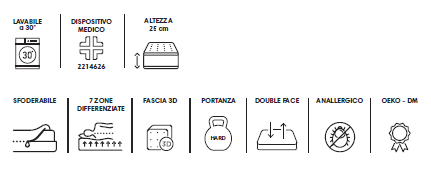 Il perfetto incontro tra comfort e tecnologia, Senso sostiene il riposo con le sue 1.600 micromolle. Il sistema di molleggio si organizza in 7 zone con molle insacchettate indipendenti dal diametro di 40 millimetri. Le zone differenziate permettono un’azione ergonomica costante durante tutto il riposo. A potenziare la confortevolezza delle molle, uno strato di V Memo 50 mm stimola il distendimento muscolare e incentiva la circolazione sanguigna senza generare punti anomali di compressione che potrebbero interferire con il riposo. Il sistema V Memo è automodellante e termoregolante: infatti, sfrutta il calore del corpo con cui si modella. Senso unisce l’intensità di un saldo sostegno con la perfezione ergonomica della superficie di contatto soffice e delicata. Il tessuto antibatterico, anallergico e traspirante è in viscosa 380 gr e certificata Oeko-Tex, per una piacevole sensazione di freschezza a contatto con la pelle. È assicurata l’assoluta protezione anallergica grazie all’imbottitura Dacron 500 gr, una vera garanzia antimicrobica e antibatterica. All’innovazione tecnologica si aggiunge un tocco di eleganza con il prezioso capitonné a stella