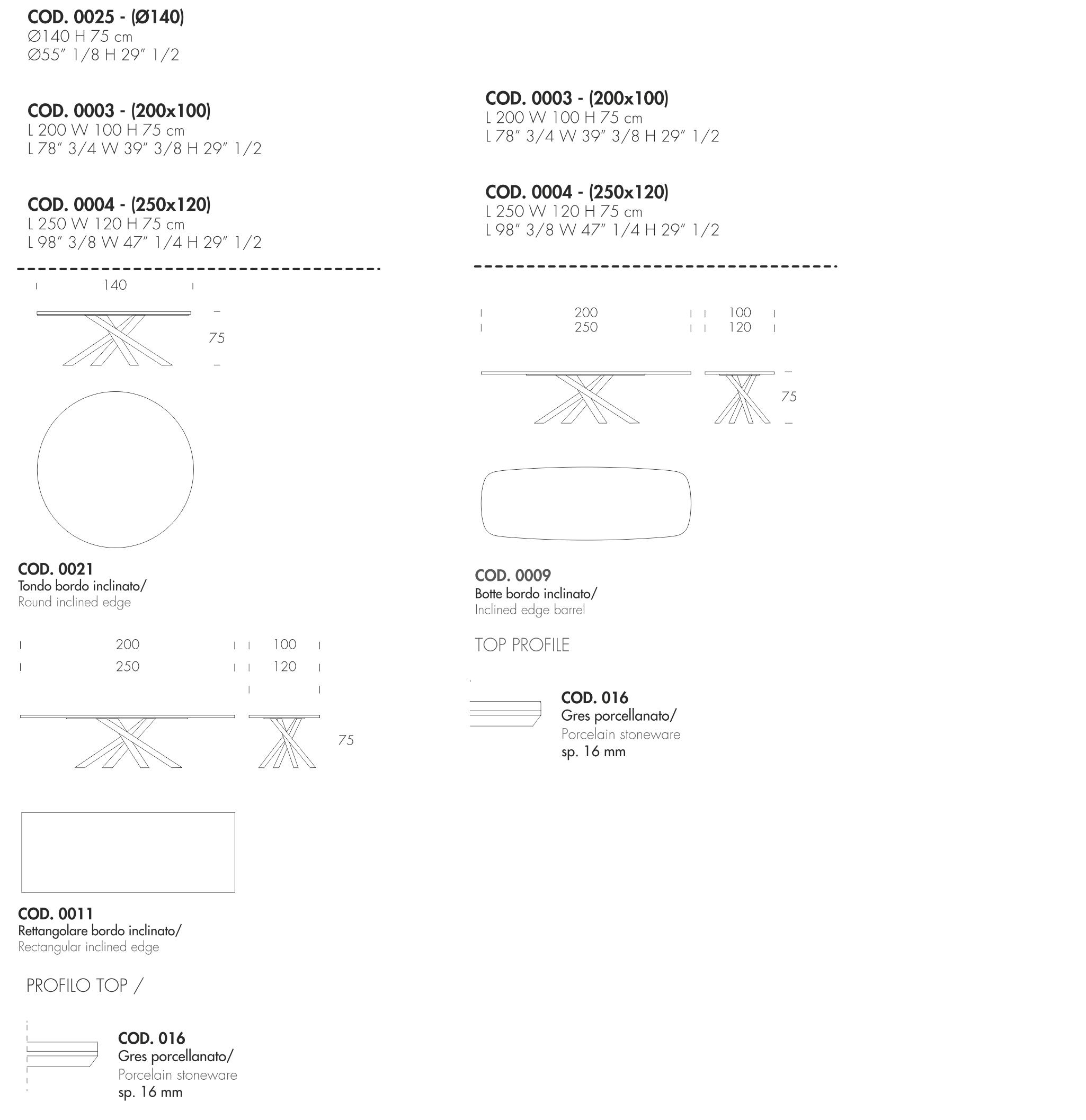 Tavolo fisso con base in acciaio verniciato, piano tondo/rettangolare/ovale in ceramica, bordo inclinato.