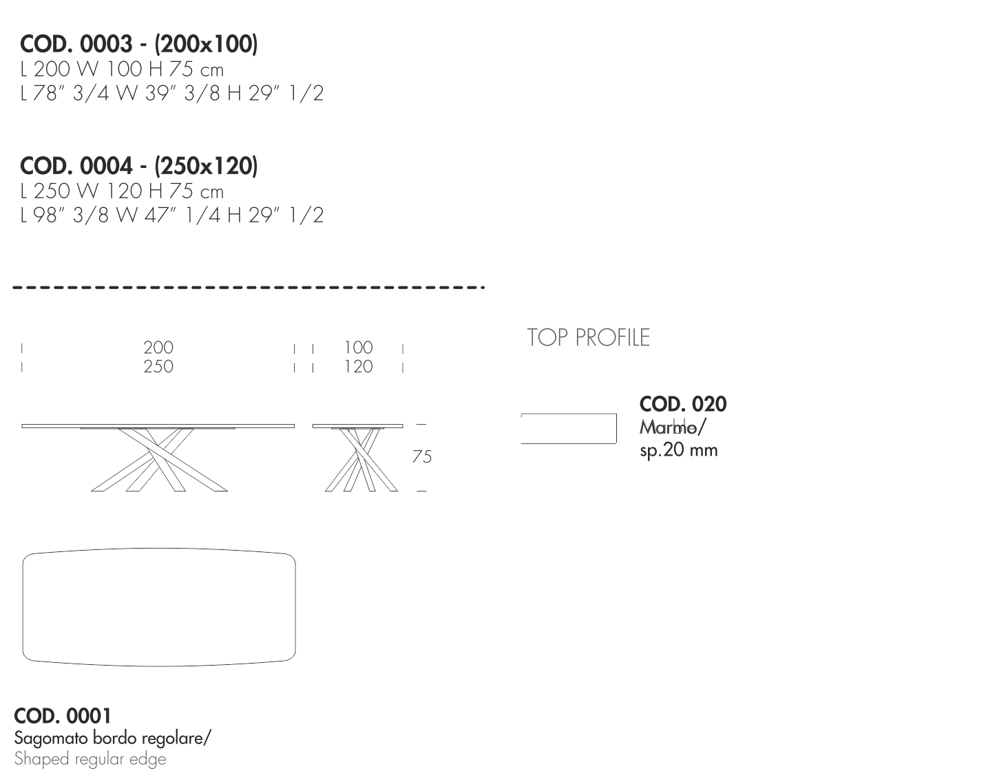 Tavolo fisso con base in acciaio verniciato, piano sagomato in marmo, bordo regolare