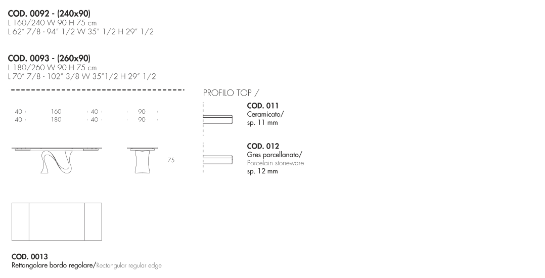 Tavolo allungabile con base in agglomerato, piano e allunghe in gres porcellanato o ceramica.