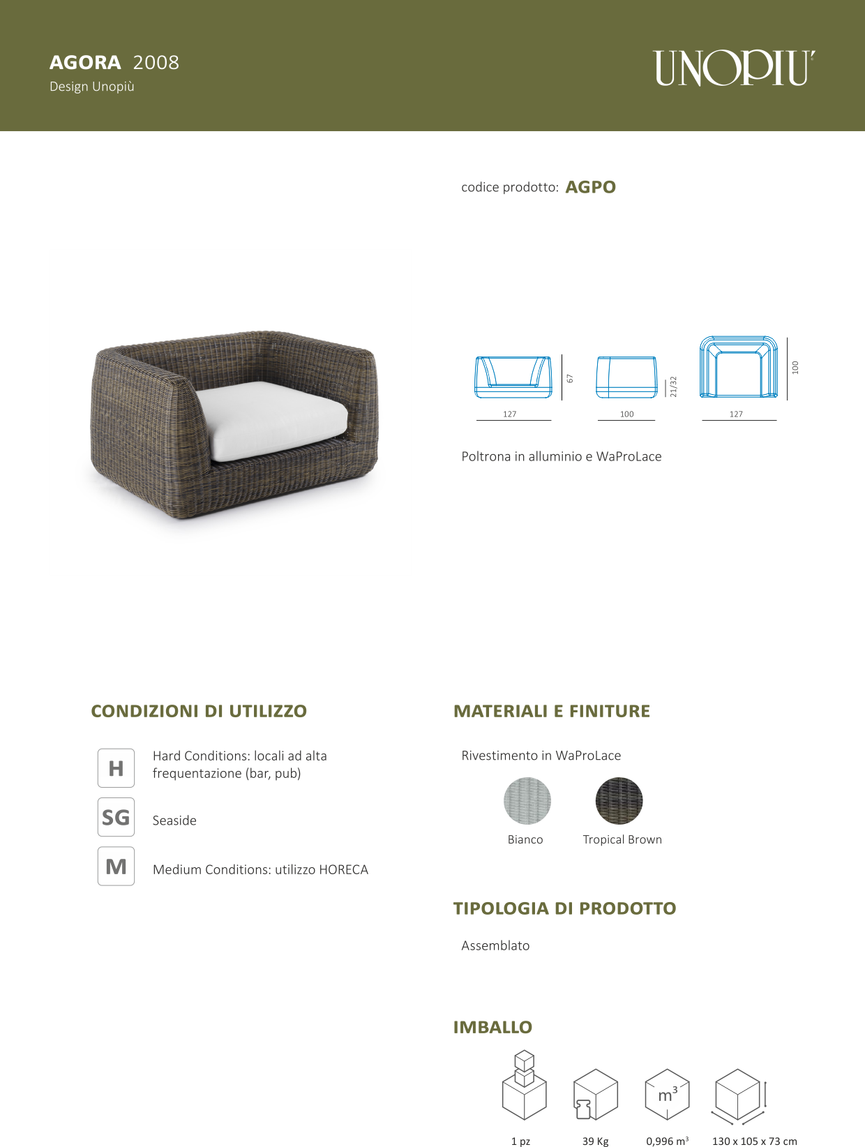 Poltrona Agorà comprensivo di cuscino seduta. La poltrona Agorà è realizzata in fibra sintetica WaProLace di color tropical brown intrecciata a mano - robusto rivestimento a trama fitta, caratteristico di molte delle poltrone da esterno delle collezioni outdoor Unopiù, che ricopre interamente la sottostante struttura portante in alluminio. La generosa profondità della seduta, pari a cm 100, tratto distintivo dell’intera linea, si accompagna ad un’altezza di schienale relativamente ridotta, pari a cm 67 (quella di seduta è di soli cm 32) e ad una lunghezza consistente, di cm 127, per dar vita ad una poltrona dall’aspetto solido e dalle linee ampie e diritte, la cui rigorosità è però lievemente ammorbidita da una leggera rastremazione verso l’alto degli ampi braccioli.