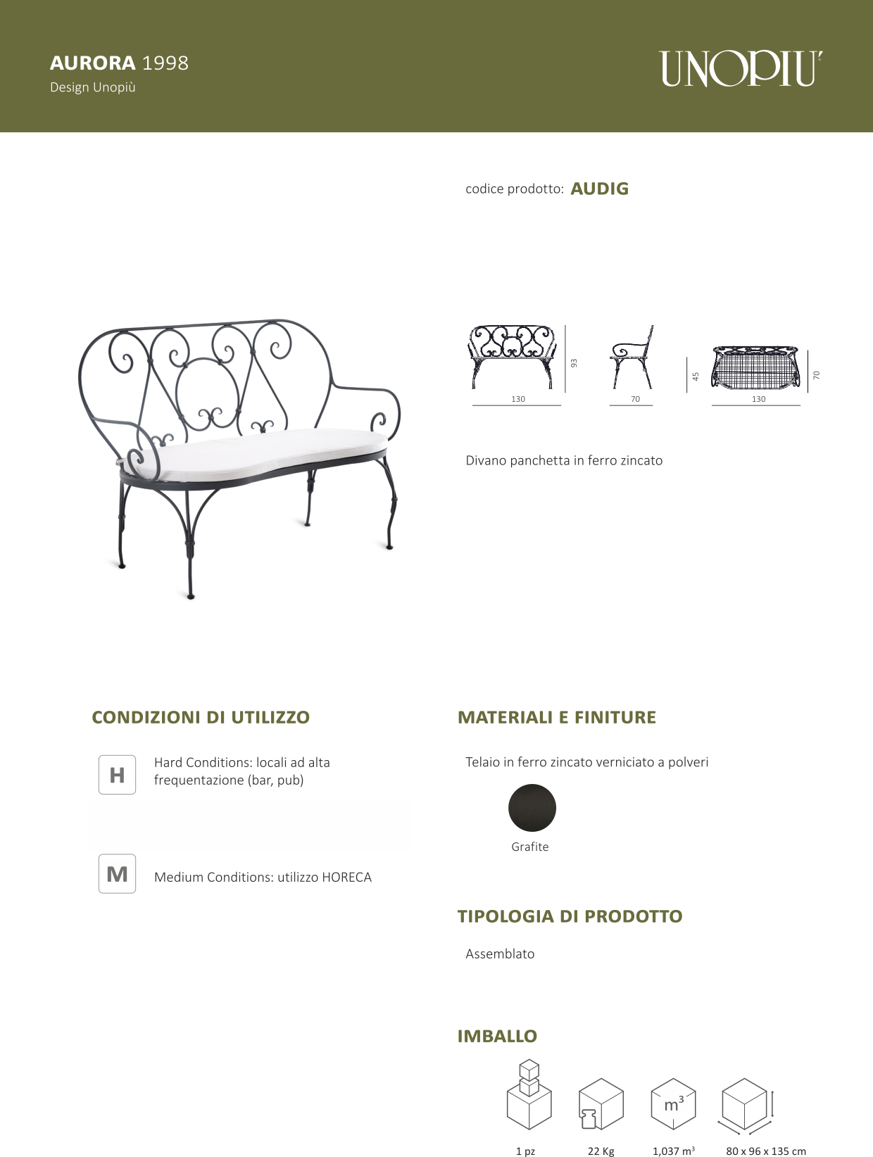 Il divanetto AURORA è realizzato a mano in ferro battuto e zincato, la griglia della seduta è in acciaio inossidabile.