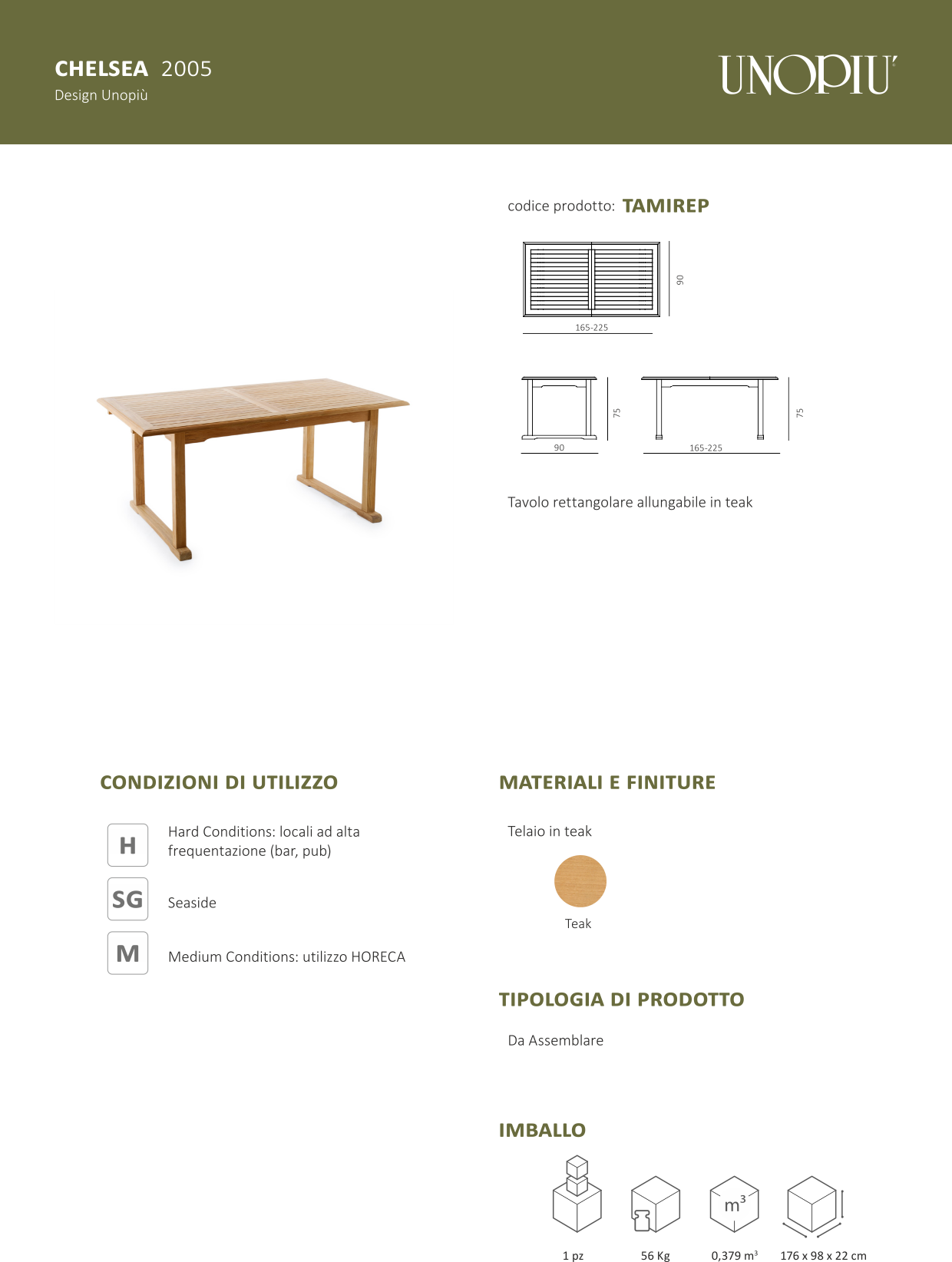 Il modello rettangolare del tavolo Chelsea, di dimensioni pari a cm 90 x 165 nella versione base e a cm 90 x 225 nella versione allungata, presenta una base composta di quattro gambe unite a due a due lungo il lato corto, ed un ampio piano in listelli di teak che si allunga notevolmente nella versione estesa, e può ospitare comodamente un ombrellone che non è necessario rimuovere in caso di estensione.