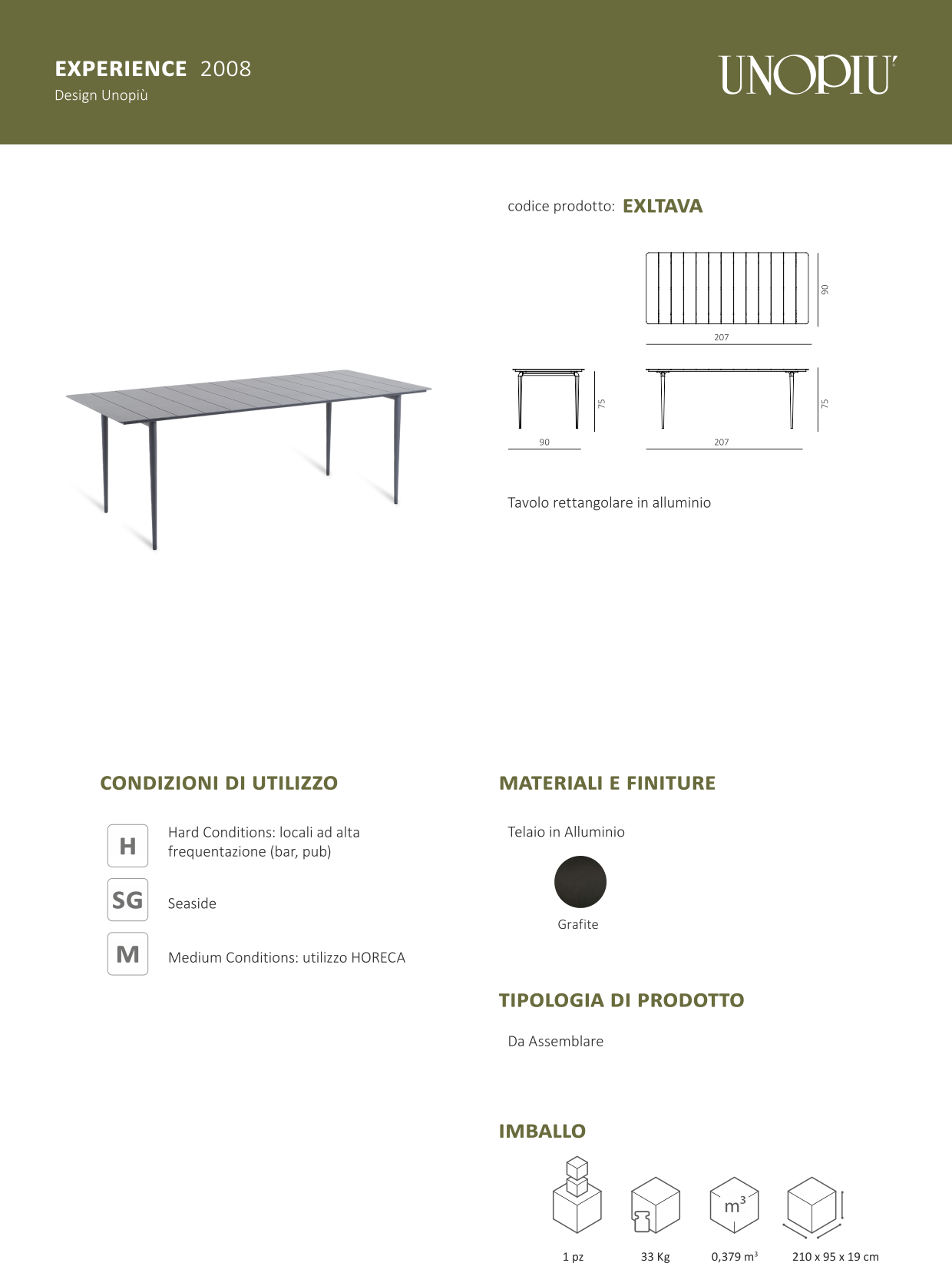 Di forma rettangolare e dimensioni di cm 205 x 90 H 75, il tavolo alto da giardino Experience si compone di una solida ma leggera struttura in fusione di alluminio di color grafite.