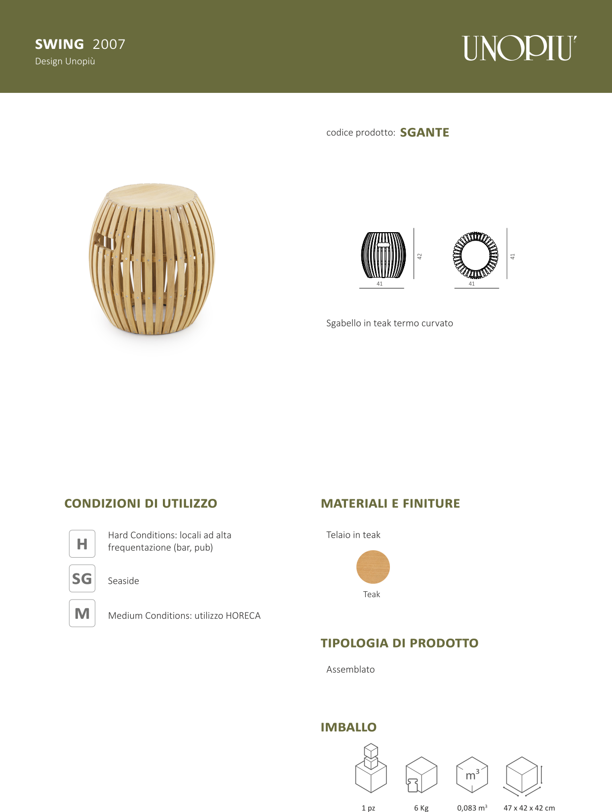 I listelli di teak curvato conferiscono alla chaise-longue, al tavolo e allo sgabello Swing un aspetto sinuoso che evoca atmosfere orientali.