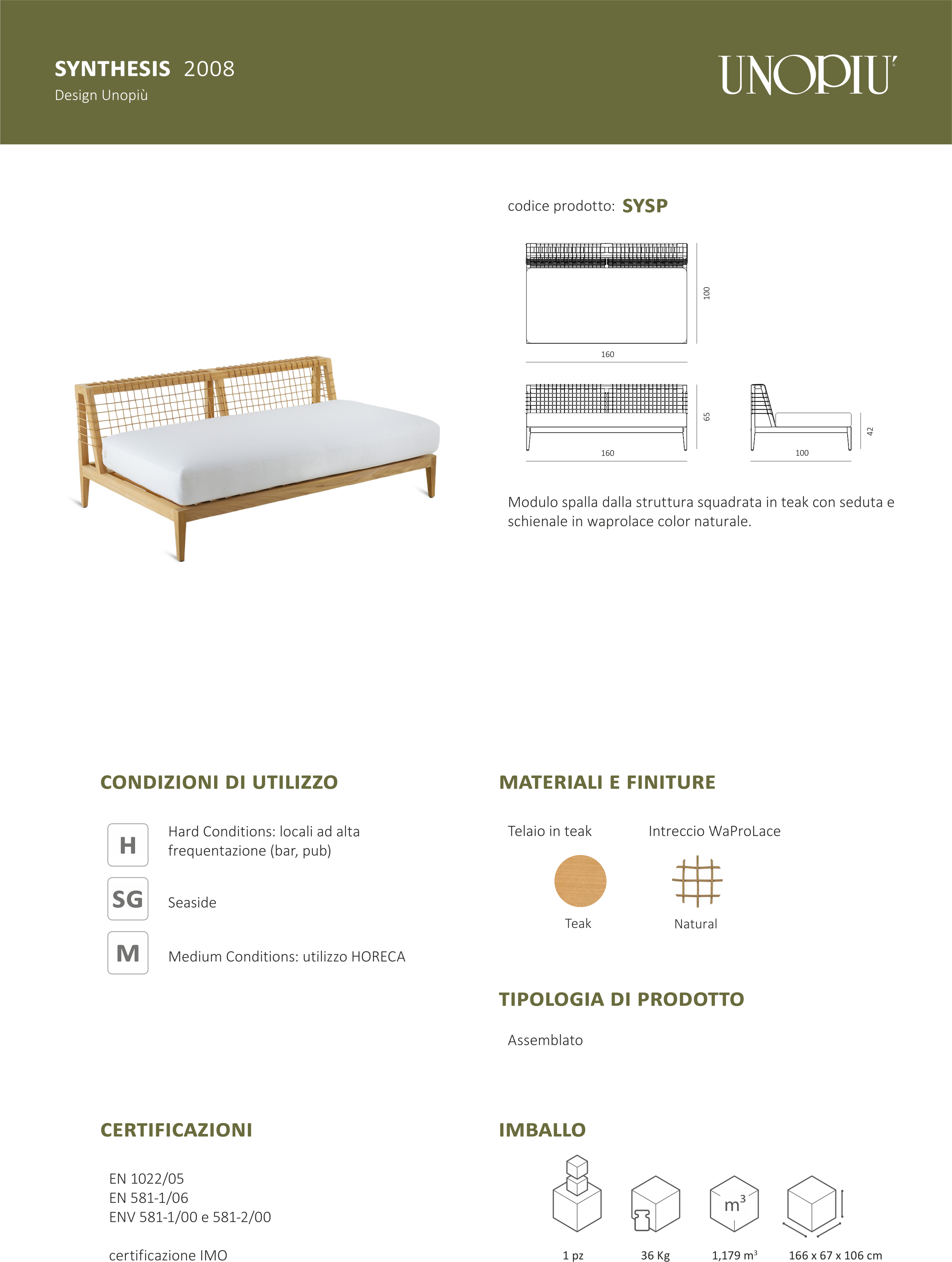 Il modulo spalla Synthesis è una seduta dalla struttura solida, ma esteticamente leggera: come tutti gli elementi della collezione modulare Synthesis, è realizzata interamente in teak e ad essa è ancorata una rete a maglie larghe di fibra sintetica WaProLace color legno tessuta a mano, che funge da schienale comodamente inclinato. Non sono presenti braccioli. La seduta, sostenuta da corte gambe, è ampia, bassa e profonda: le sue dimensioni sono pari a cm L 160, P 100, H 65, sed. H 42.